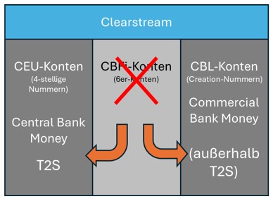 Damit verbleiben nach der laufenden Umstellung die CEU-Konten für CeBM (Central Bank Money) -Settlement in T2S und CBL-Konten für CoBM (Commercial Bank Money) -Settlement außerhalb von T2S.